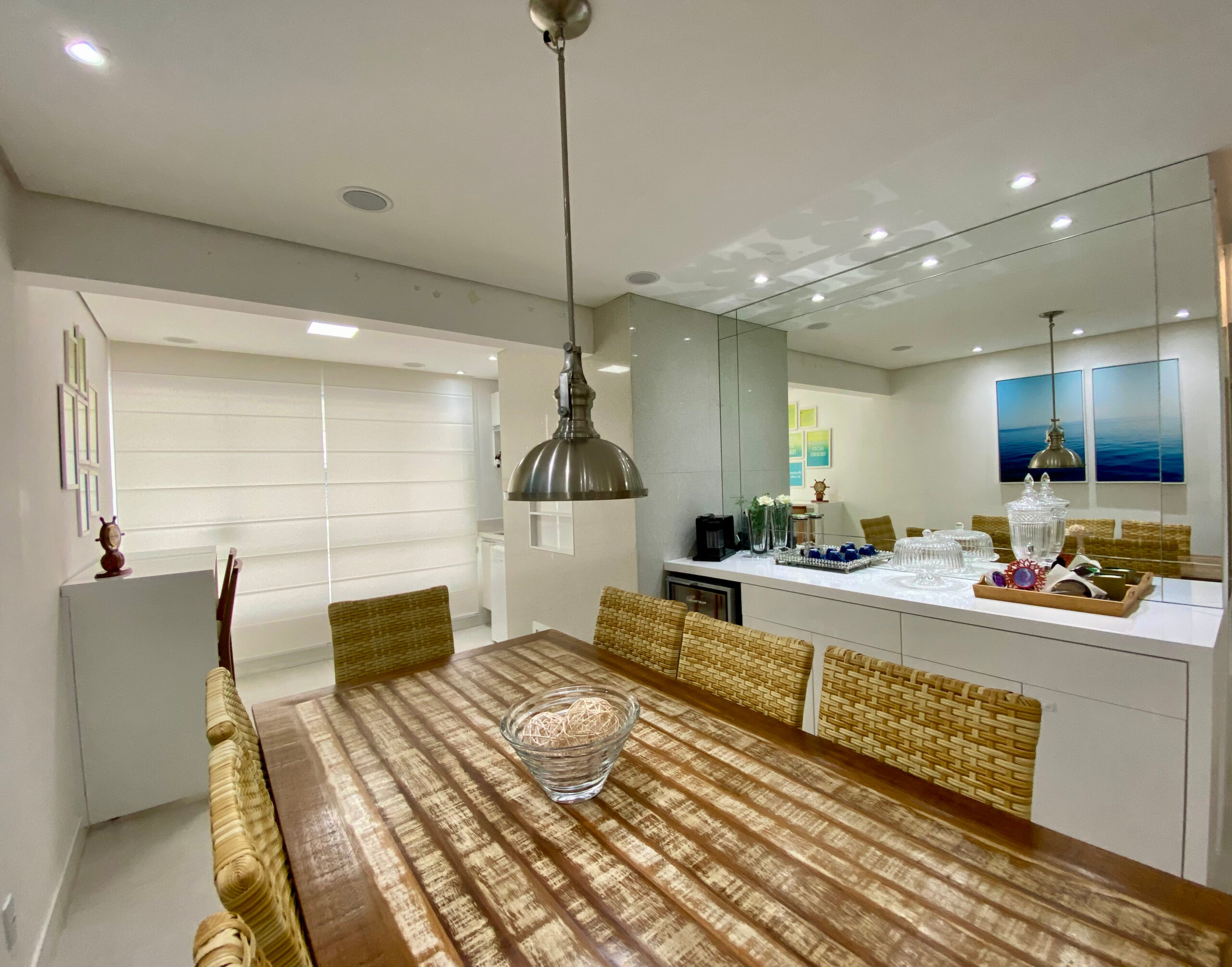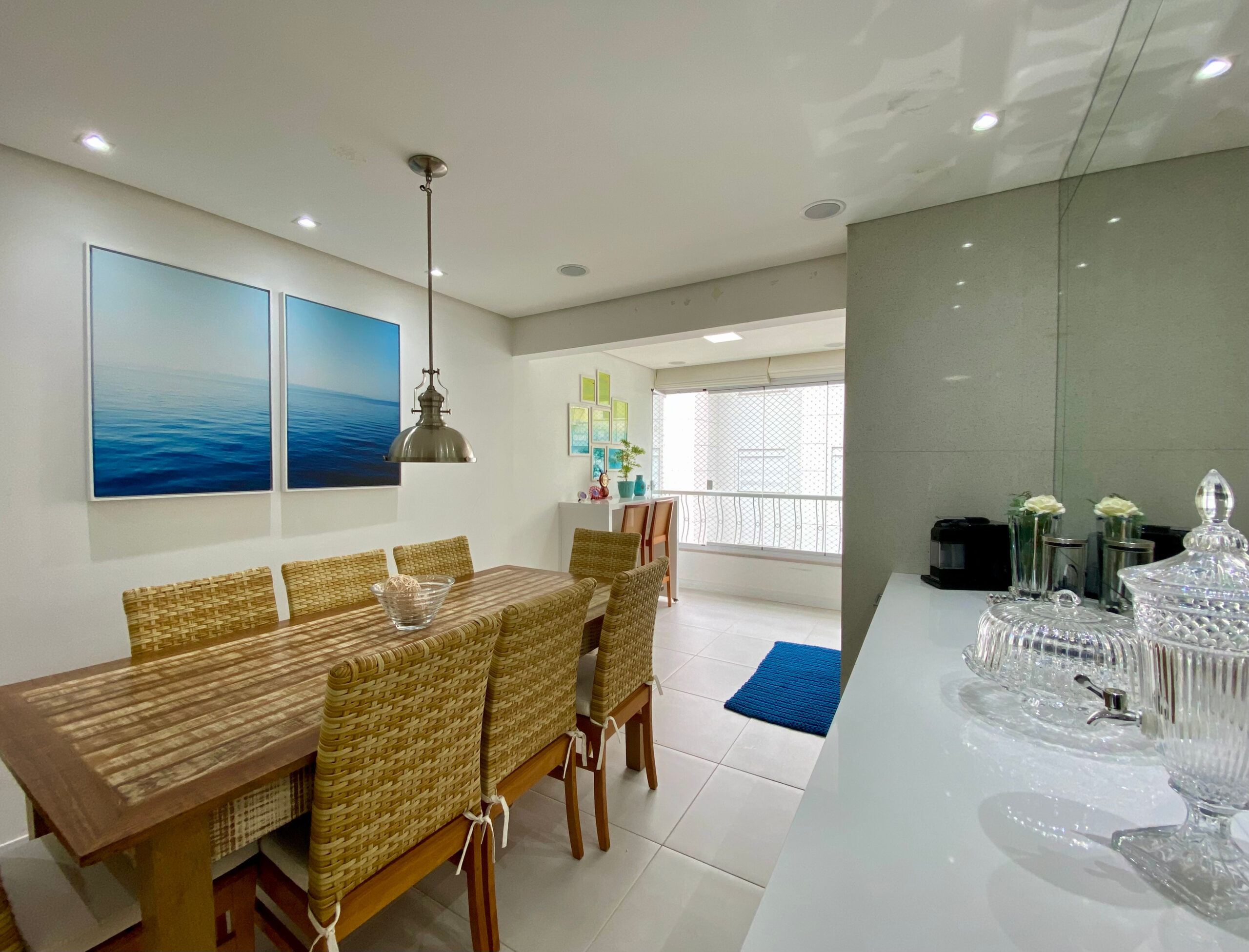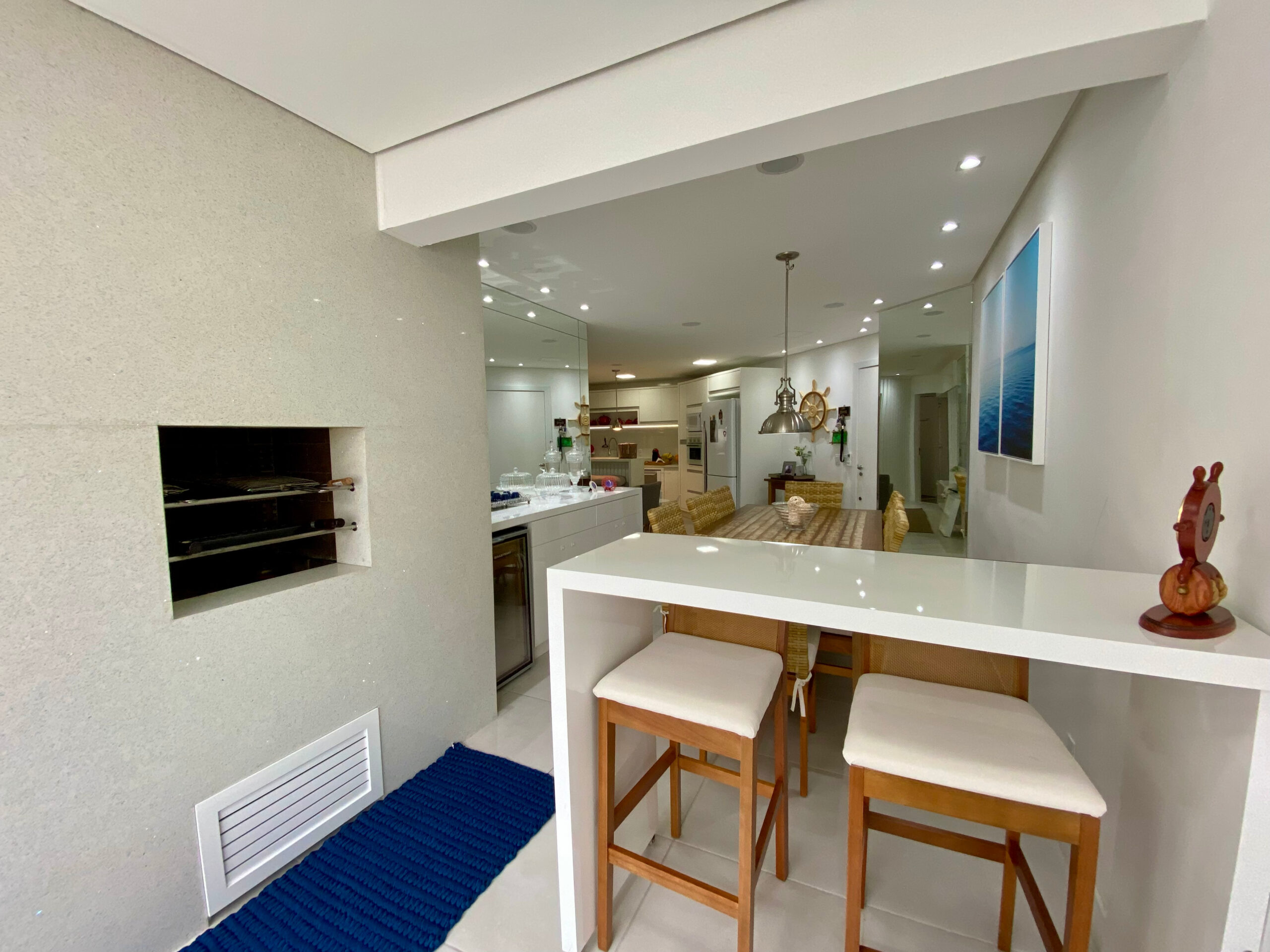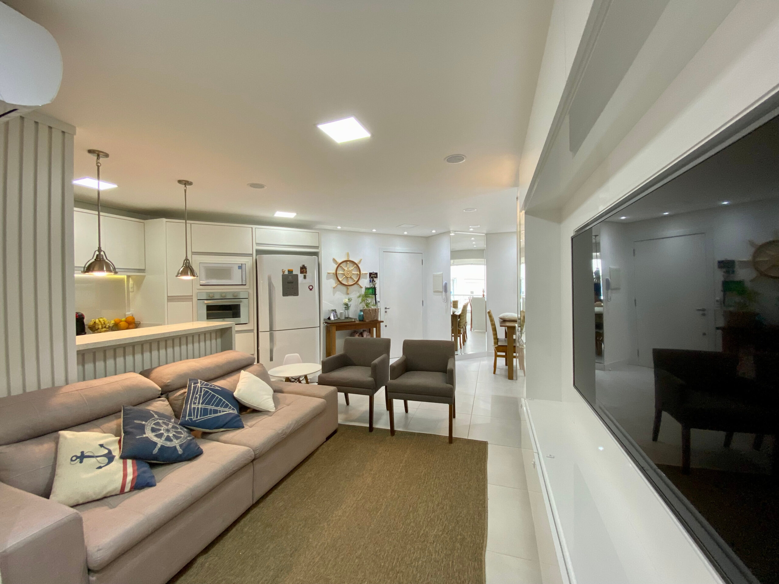 Sala de tv integrada com a cozinha para compartilhar momentos em família, ambiente de sala de jantar com varanda estendida, fechada e com churrasqueira a carvão.