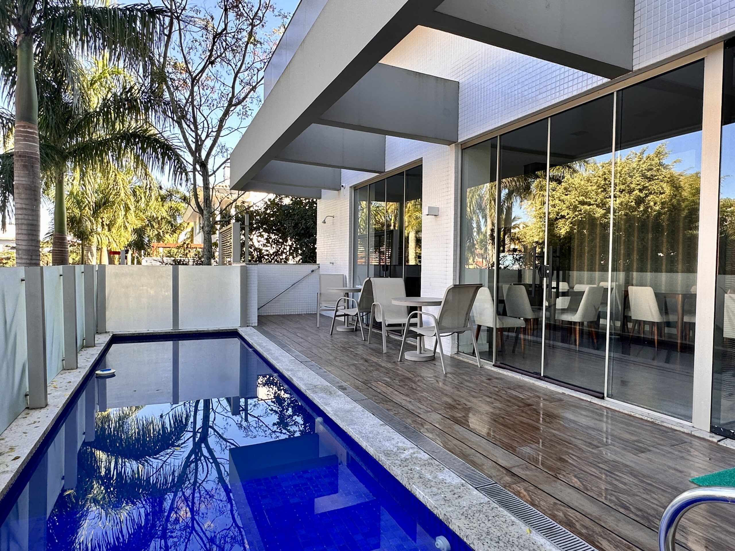 Condomínio com poucos apartamentos, e área de lazer com piscina e salão de festas.