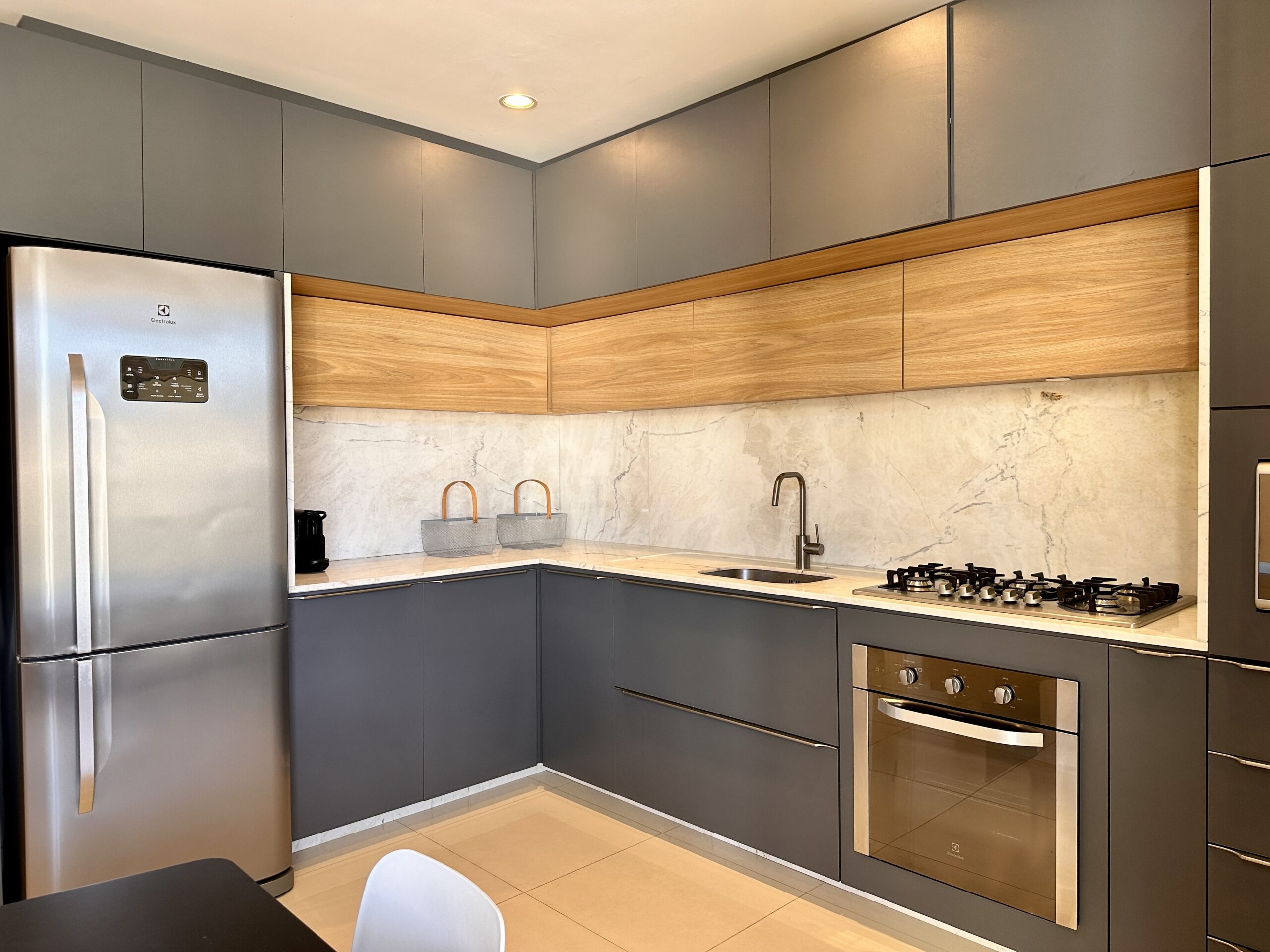 O imóvel possui móveis planejados na cozinha e eletrodomésticos instalados.