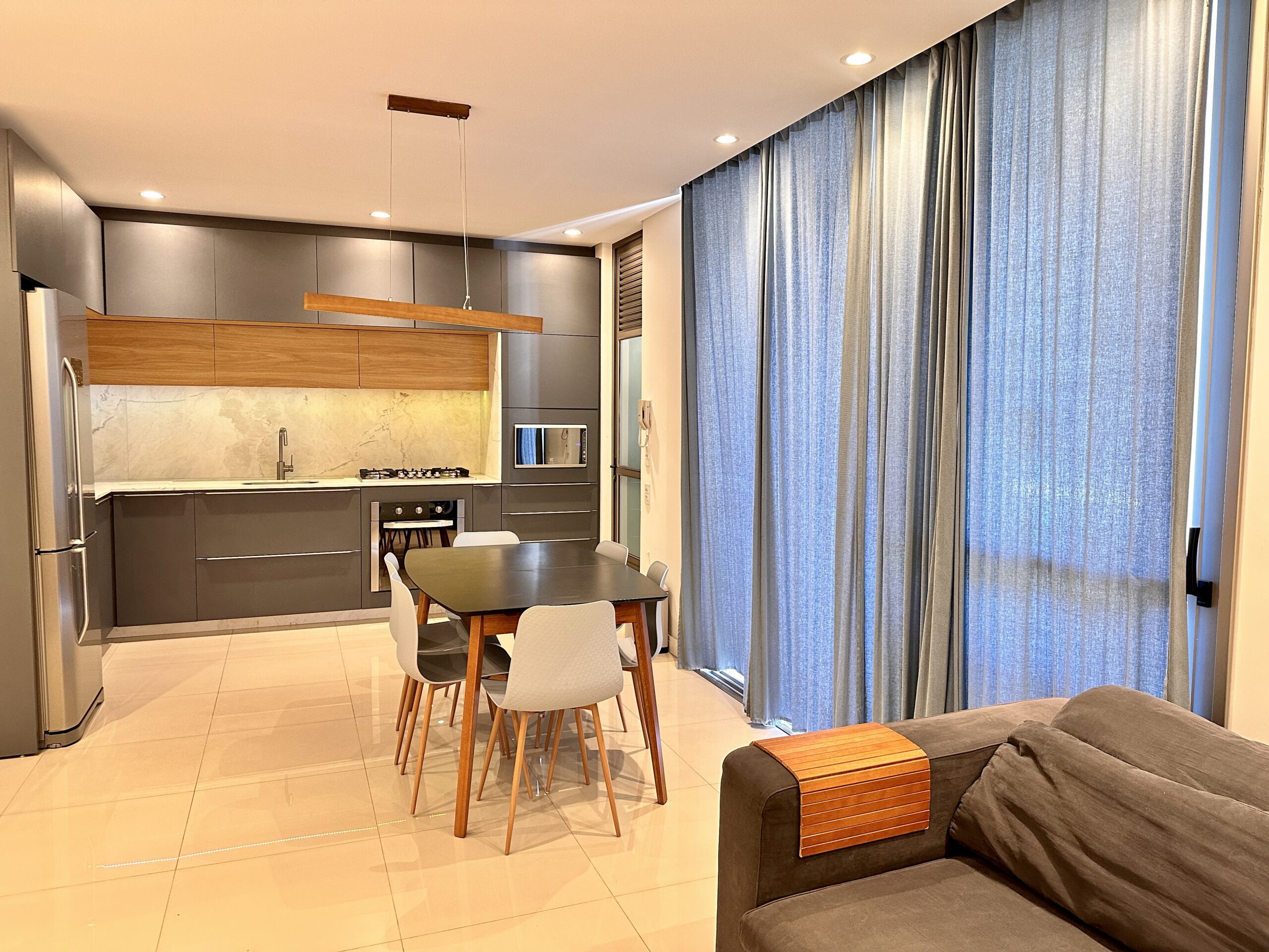 O apartamento possui sala e cozinha integradas e sacada com churrasqueira com vista para o nascer do sol.